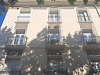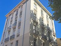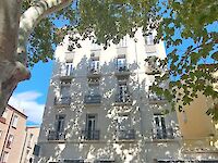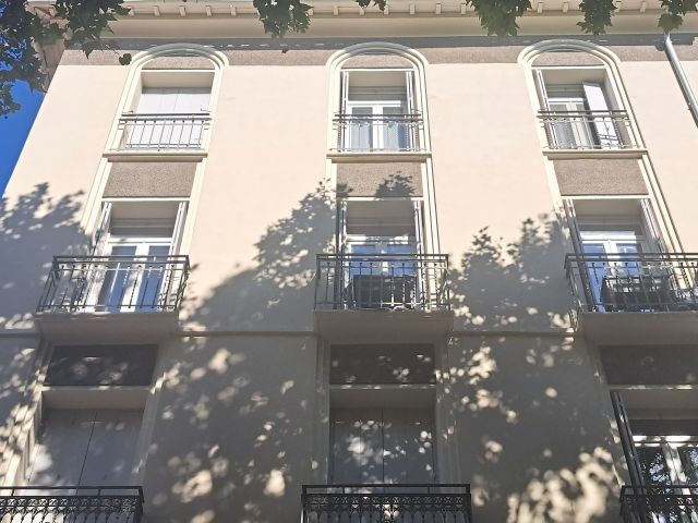 Très joliment ravalé dans un camaïeu de gris, cet immeuble, qui est l’extension et la surélévation d’un bâtiment plus ancien, marque bien un des angles de la place de Belgique et se raccorde avec délicatesse à l’immeuble voisin.