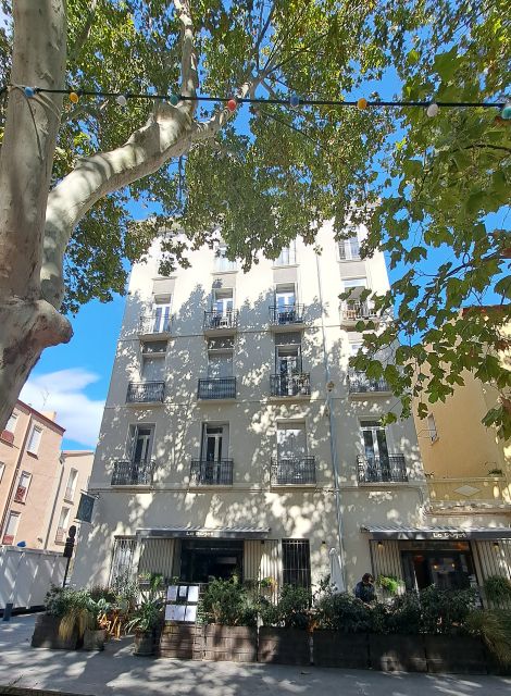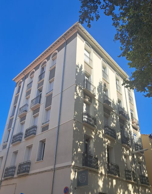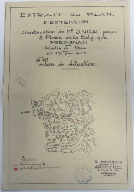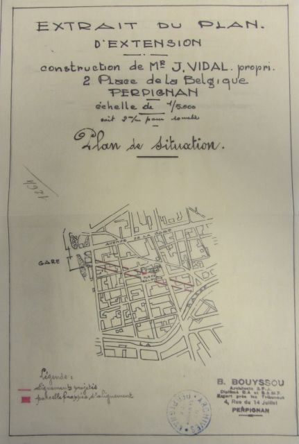 Le terrain sur lequel a été érigé cet immeuble dépendait à la fin du XIXe siècle de la métairie Conte dans le quartier de la Gare. Sur celui-ci sera édifié, au début des années 1880, un premier bâtiment élevé d’un étage sur rez-de-chaussée où sera exploité pendant quelques mois un Concert-Bijou (voir rubrique « Le saviez-vous » ?). Le bâtiment est revendu par Mme Albertine Biscahy veuve de M. Joseph Chapus à M. Joseph Vidal négociant et à Mme Joséphine Esplandiu son épouse le 10 octobre 1933 en l’étude de Me Arres notaire à Perpignan.